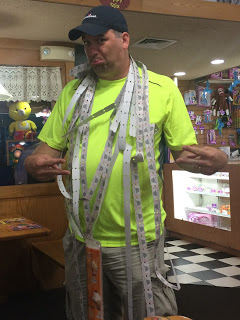 Once we were in Galena, we celebrated Carson and Grandpa’s birthday by going to Happy Joe’s Pizza (discovered that it was a chain restaurant). As you can see, Jeff had just as much fun playing the games as all the kids did. Carson got to open a bunch of birthday gifts and just about all of them coincidentally were perfect to take along on a road trip!