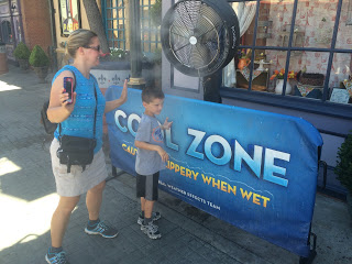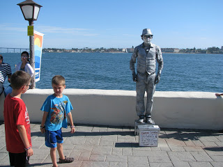 | The boys didn’t know what to make of the Human Robot Statue. Put money in his tip jar and he moved and sounded like a robot. |