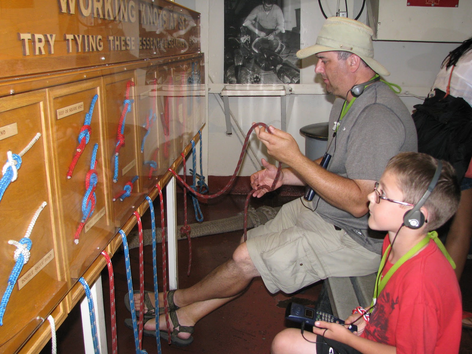 | Jeff and Spencer trying all the different knots that were used on the ship. |