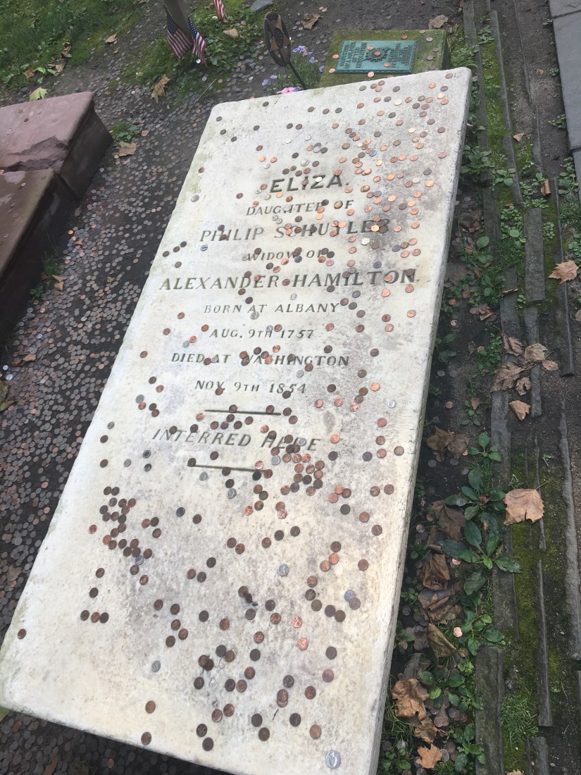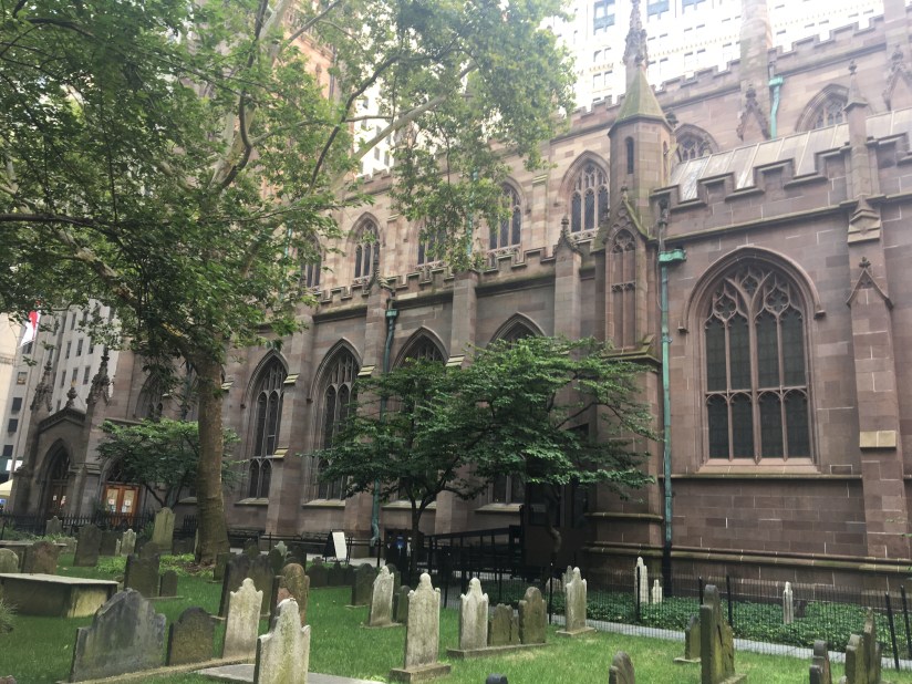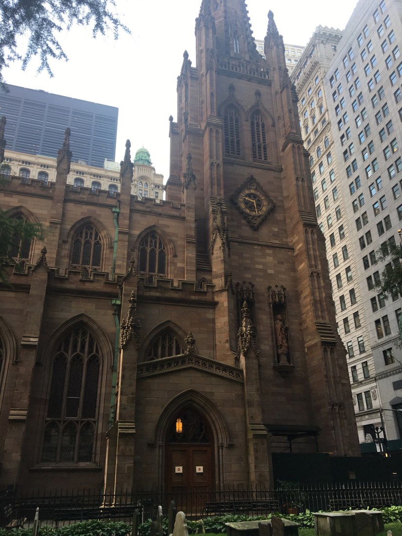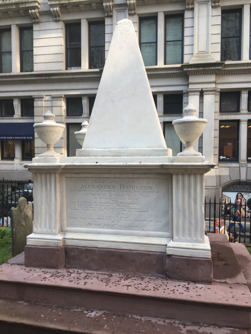 After we took the subway south to the financial district, we walked around a bit. We saw the New York Stock Exchange, walked through Trinity Church graveyard to see Alexander Hamilton and his wife’s gravesite. (I just finished reading My Dear Hamilton and am fascinated by the lives of the women during the Revolutionary War period.) FYI, the Kline family ancestors provided the beautiful stone for Trinity Church.