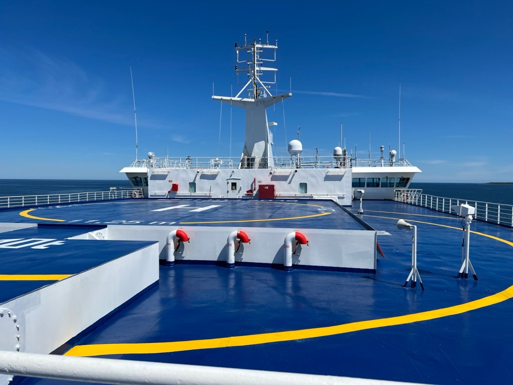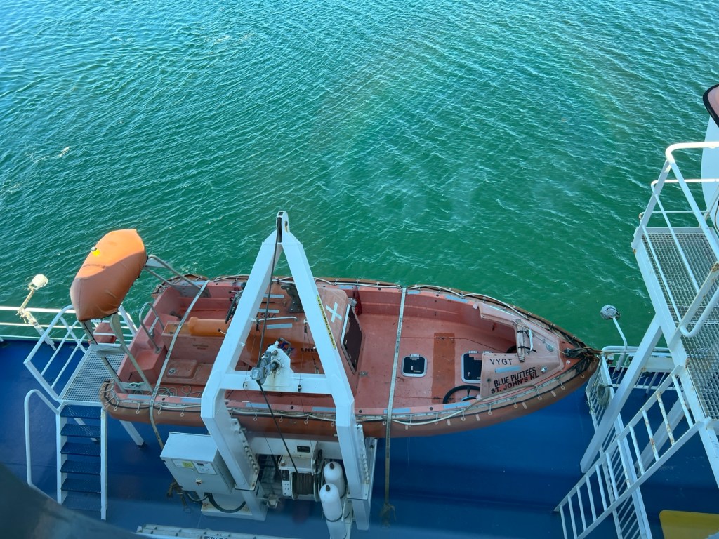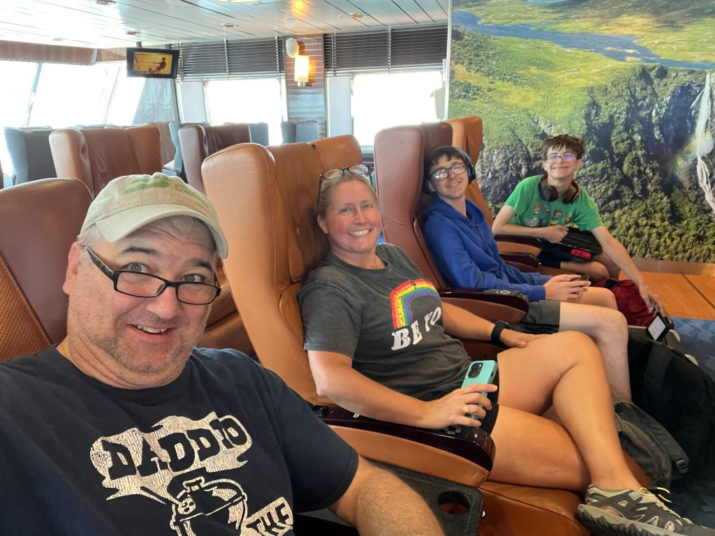 The next morning, we drove for a couple more hours until we got to the Car Ferry to Newfoundland. It took a couple hours to get the truck loaded up, but then we were on the way. We had 4 seats on deck 9 which was just below the top of the boat (the sun deck). During the 7 hour trip, there was some snoozing, some Nintendo Switch game playing, lots of reading and even some cross stitching. We bought a whole pizza for our lunch and got ice cream. Plus Carson and I saw some dolphins, and we all saw a whale! It was actually a pretty relaxing way to travel.
