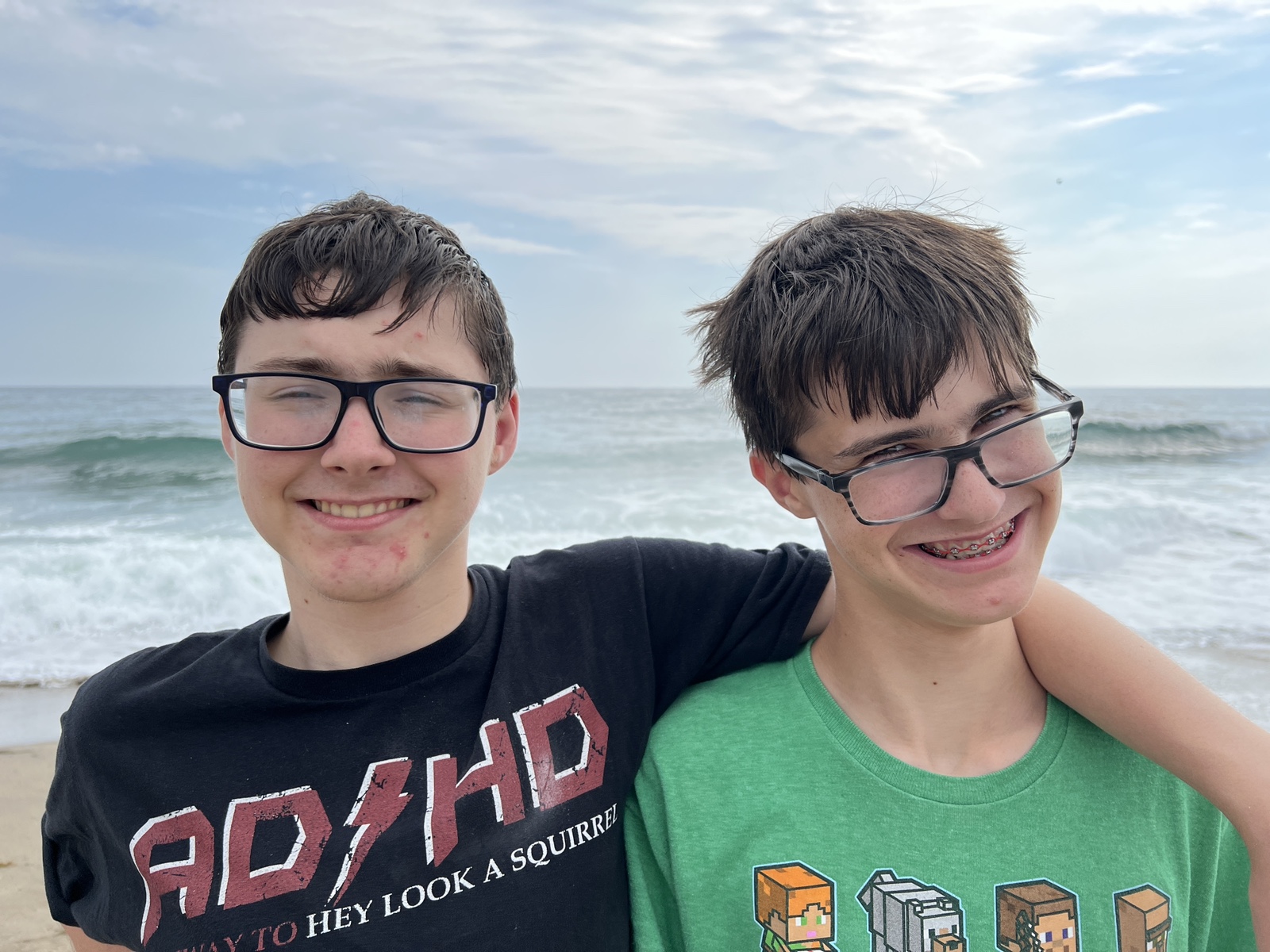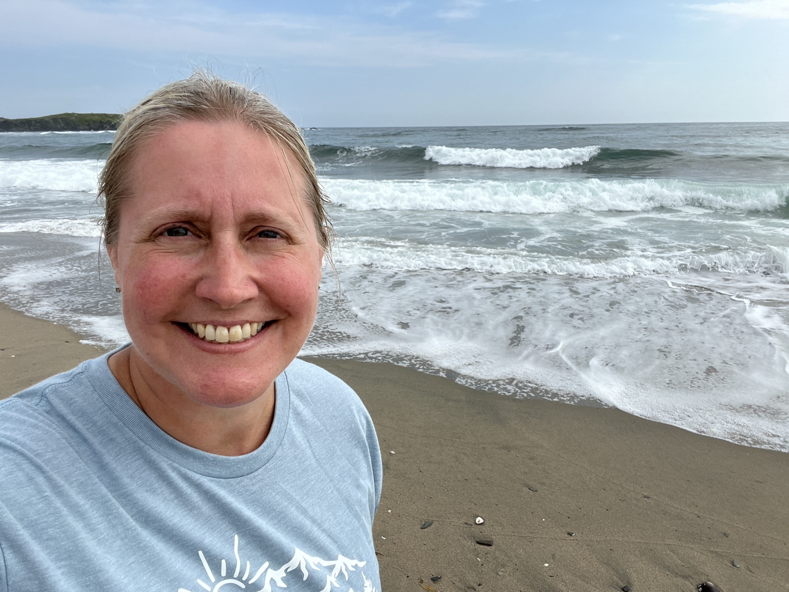 There are lots of beautiful views of the water and mountains in the distance. We stopped at one place and took lots of photos. When we got back to the campground, we drove the road that continued on to the beach and found a huge sandy beach with huge waves coming in to shore. After walking around and soaking in the sun a bit, we relaxed at the campsite the rest of the night. Carson and I also explored the campground a bit and found the waterfall and also the building with the wifi, LOL.