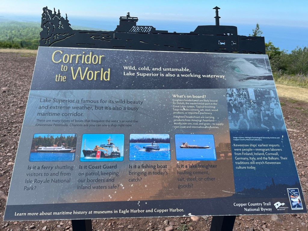 It was lunch time after our spontaneous hike so we went into Copper Falls for lunch. Though they were out of pulled pork, BBQ, brisquet, and breasted chicken “when you are at the end of the line, sometimes things don’t come in on time”, we had hamburgers and fries which were delicious. A stop at a souvenir shop and then on to Brockway Mountain Drive.